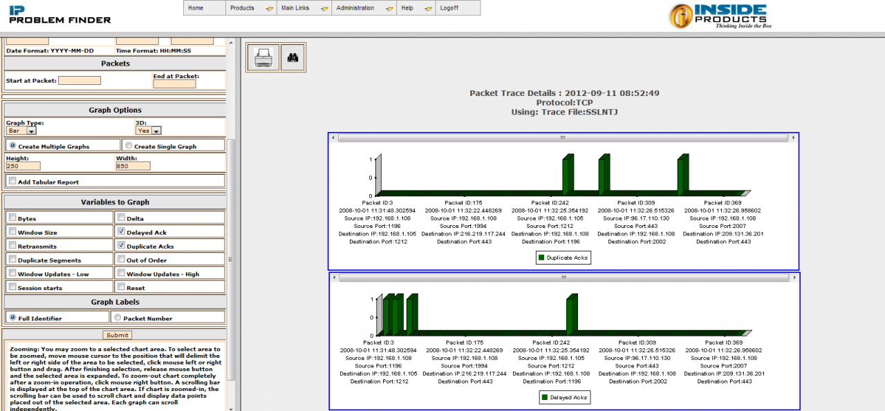 Inside ProductsTCP Problem Finder will allow you to see patterns in TCP, UDP, or ICMP traffic. As serious systems programmers know, many problems in the stack, network, or devices can be found this way. The TCP Problem Finder finds errors or inefficiencies in configuration or performance of TCP, UDP, socket applications, interfaces, network hardware, or routes.
