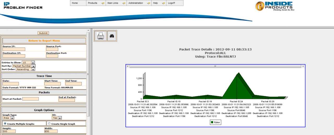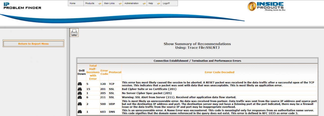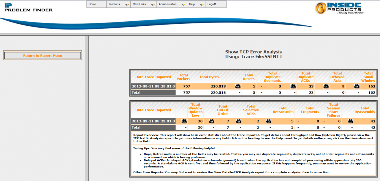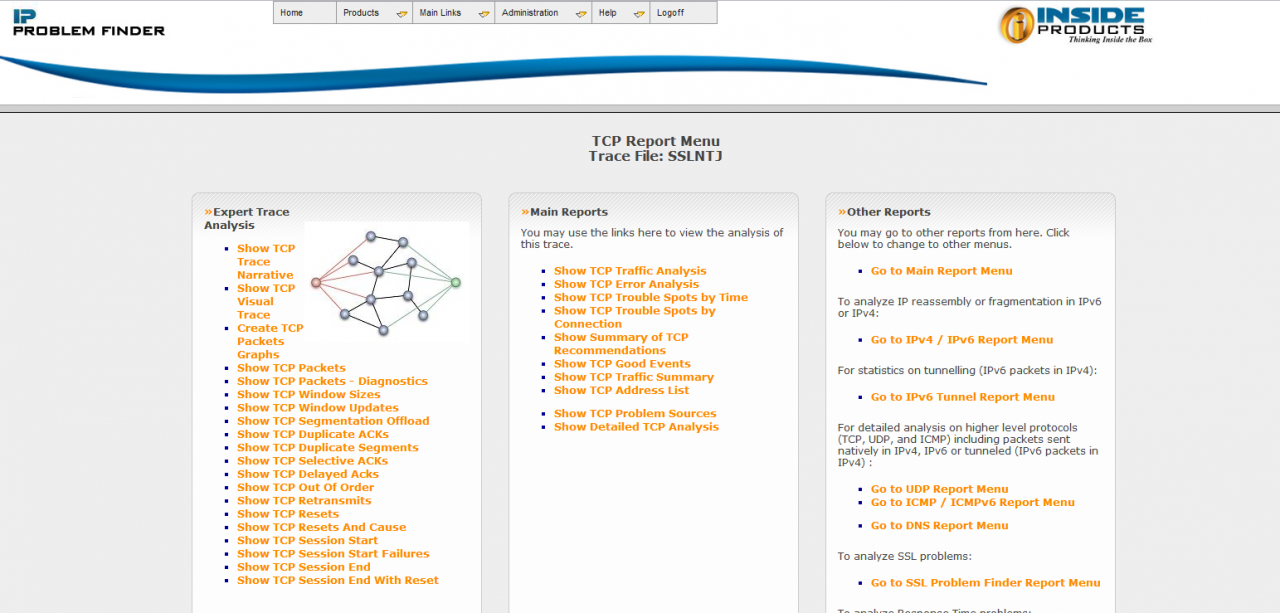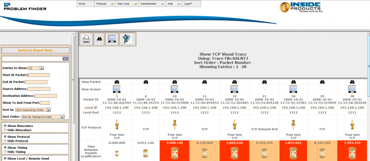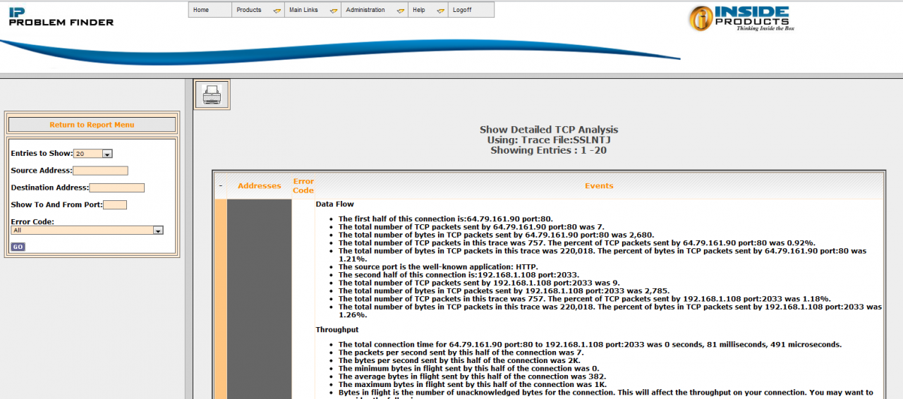 Inside ProductsTCP Problem Finder will allow you to see patterns in TCP, UDP, or ICMP traffic. As serious systems programmers know, many problems in the stack, network, or devices can be found this way. The TCP Problem Finder finds errors or inefficiencies in configuration or performance of TCP, UDP, socket applications, interfaces, network hardware, or routes.